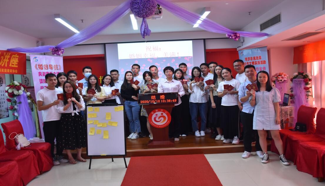 2020年10月10日,婚姻登記大廳迎來結(jié)婚登記小高峰,博羅縣民政局婚姻登記處在頒證室為新人們開展了一場(chǎng)新婚知識(shí)講座。新婚夫婦及新友團(tuán)50余人參加。當(dāng)天共辦理婚姻登記172對(duì)。