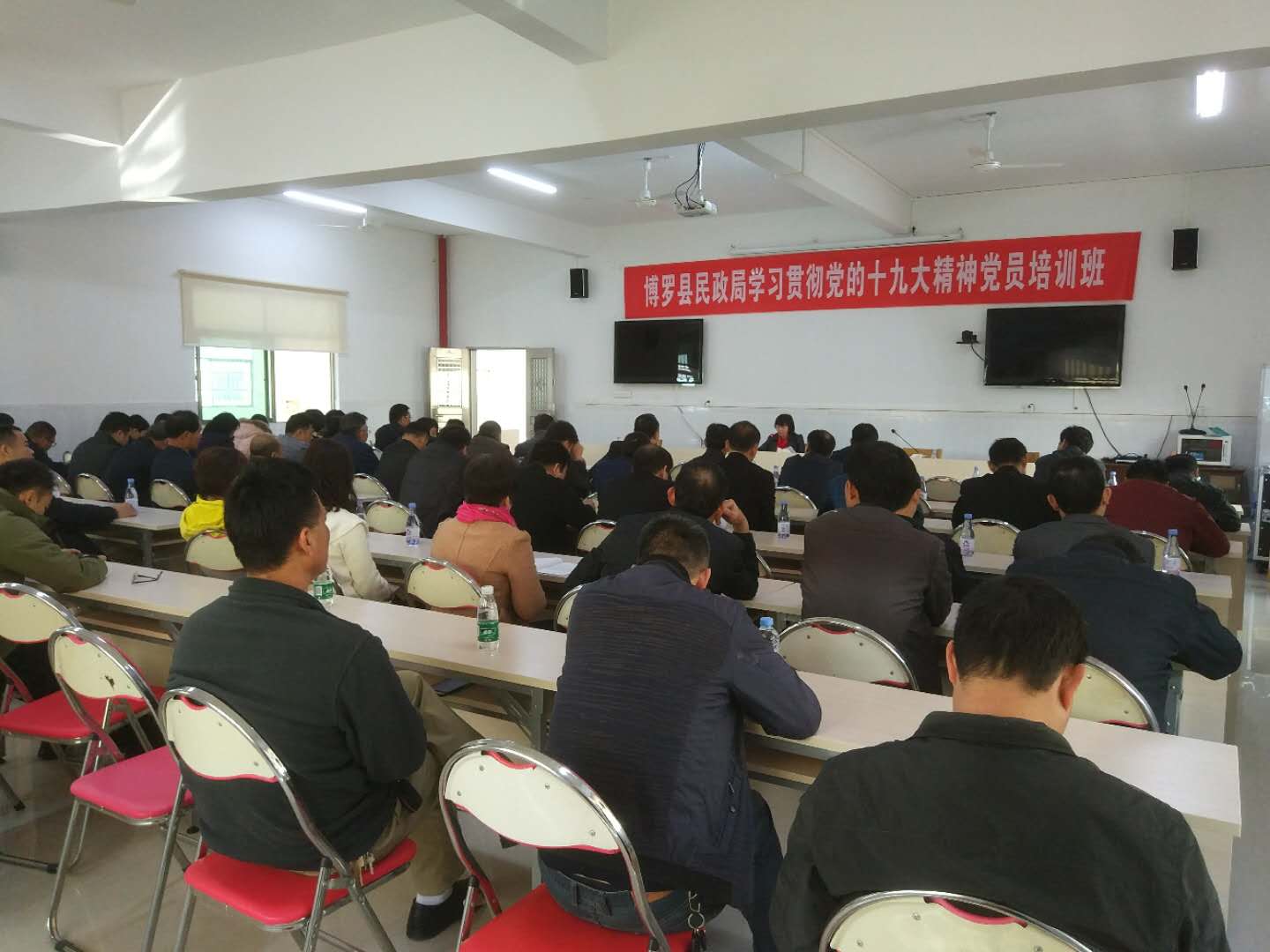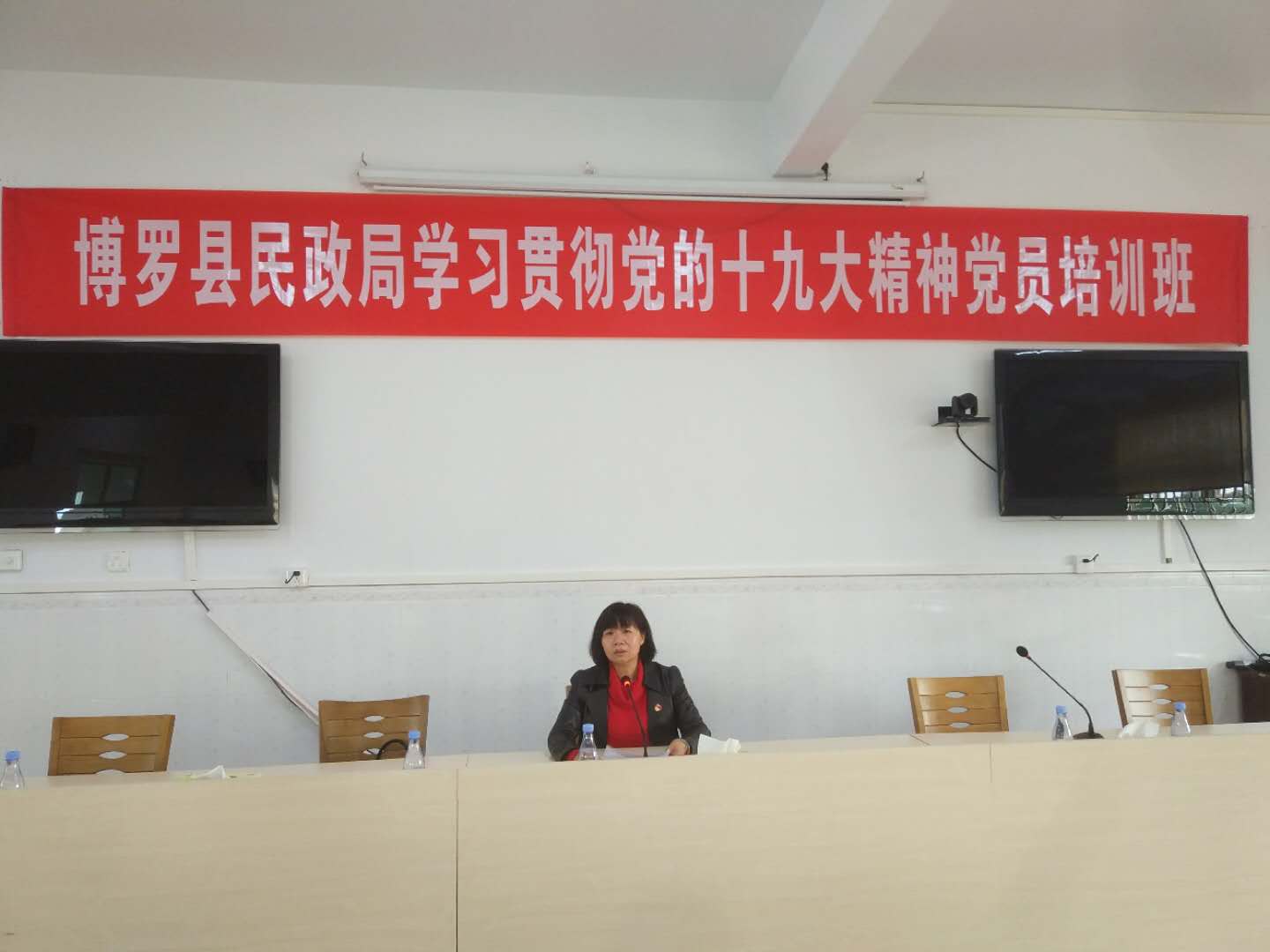 2017年12月29日上午,縣民政局黨總支部召開全體黨員大會,會議由縣民政局副局長、黨總支副書記李淑晶主持。會上,李淑晶同志首先強調元旦春節期間全體黨員要牢固樹立“四個意識”,廉潔自律,嚴防“四風”問題反彈回潮。隨后,輔導全體黨員深入學習《十九大黨章修正案》。最后,舉行博羅縣民政局學習貫徹黨的十九大精神黨員培訓班。