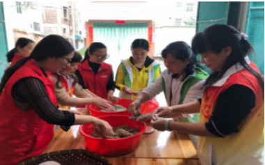 活動開始,由張社工講解此次活動的意義、探訪時與長者交流的技巧及注意事項等。隨后開始制作艾粄,從艾草的處理、和面的技巧、包餡的注意事項等,志愿者都極盡詳細地傳授給大家。桔子居委干部、社工也親自嘗試到制作的每一個步驟中。人多力量大,經過一會兒的功夫艾粄就制作完成了。大家將蒸熟的艾粄分裝好。緊接著居委干部、社工、志愿者們提著艾粄以探訪的方式進行登門走訪,為社區的低保戶以及殘障人士送去親手制作的艾粄。在探訪過程中,居委干部和社工了解探訪對象最近的生活情況。志愿者們則為探訪對象講解春季養生小常識。活動的開展大家都發揮著志愿服務精神,讓探訪對象得到關注和溫暖!