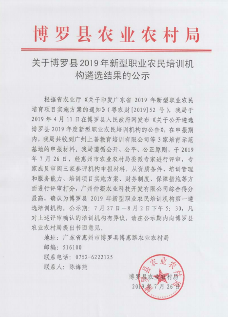 關(guān)于博羅縣2019年新型職業(yè)農(nóng)民培訓(xùn)機(jī)構(gòu)遴選結(jié)果的公示