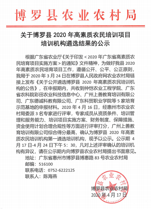 關于博羅縣2020高素質農民培訓項目培訓機構遴選結果的公示