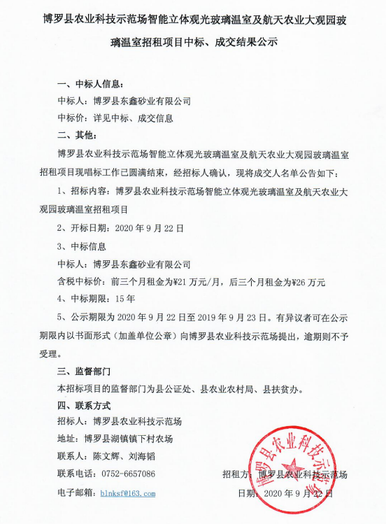 博羅縣農(nóng)業(yè)科技示范場智能立體觀光玻璃溫室及航天農(nóng)業(yè)大觀園玻璃溫室招租項(xiàng)目中標(biāo)、成交結(jié)果公示