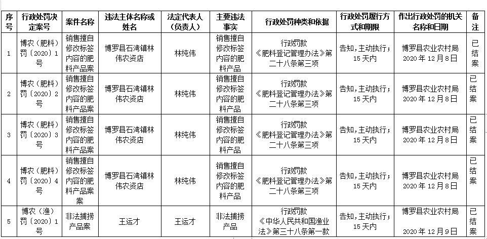 博羅縣農(nóng)業(yè)農(nóng)村局2020年農(nóng)業(yè)行政處罰案件信息公開表