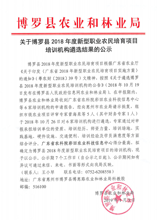 關于博羅縣2018年新型職業農民培育項目培訓機構遴選結果的公示