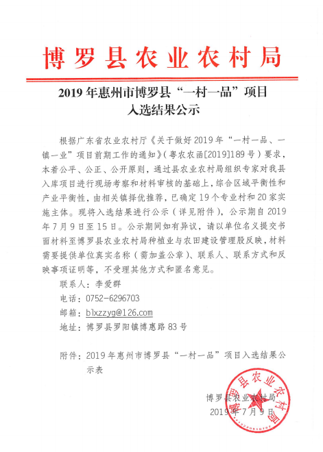 2019年惠州市博羅縣“一村一品”項目入選結果公示