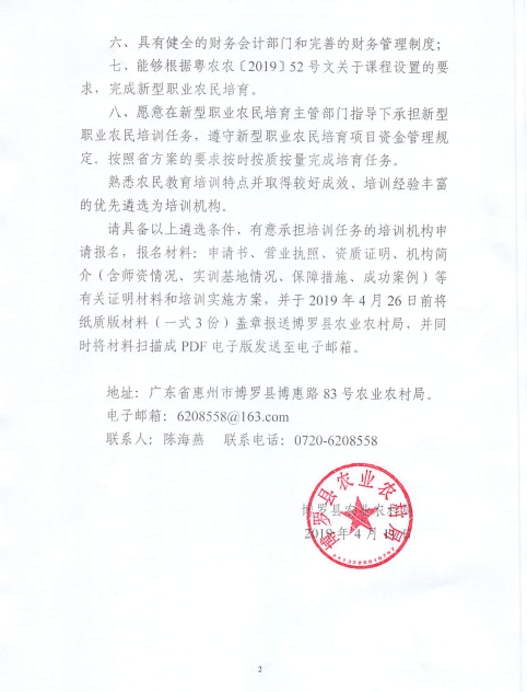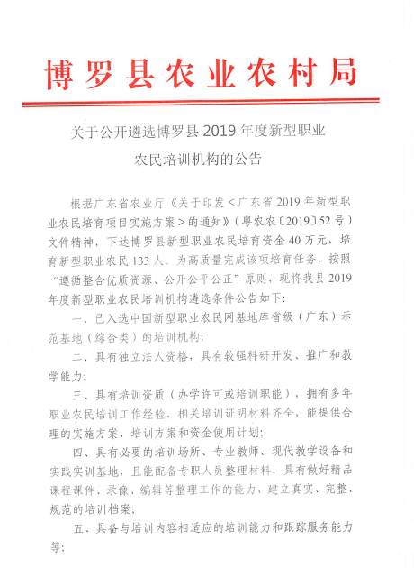關于公開遴選博羅縣2019年度新型職業農民培訓機構的公告