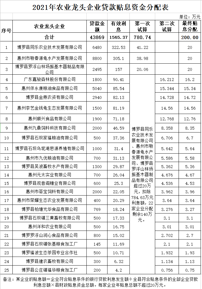 根據《關于博羅縣2021年農業龍頭企業貸款貼息項目申報的通知》(博農函[2021]70號)精神,博羅縣同樂農業技術發展有限公司等25家農業龍頭企業申報了貸款貼息,經貸款銀行審核、我局復核和組織專家組進行真實性、符合性評審。25家企業符合申報條件,有效貸款累計金額43869萬元,有效貸款利息總額1565.37萬元;項目預算安排200萬元,按權重分配、計算各家企業貼息金額(每家企業貼息不超過20萬元),并經我局黨組(擴大)會議審核同意和網上公示7天、無異議。現將資金計劃公示如下: