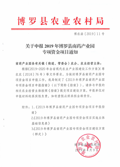 博農函【2019】11號+關于申報2019年博羅縣南藥產業(yè)園專項資金項目的通知