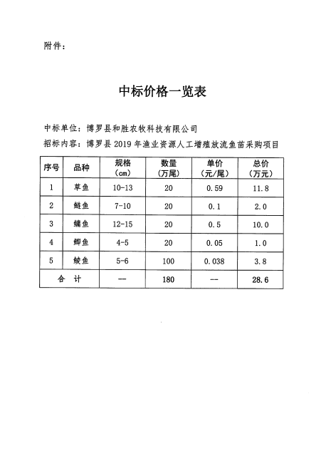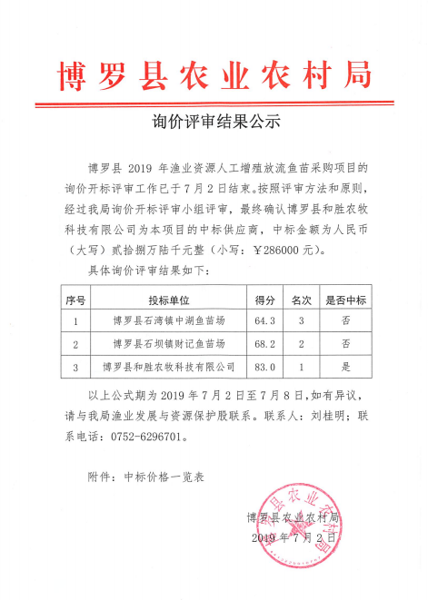 博羅縣2019年漁業資源人工增殖放流項目詢價評審結果公示