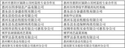 我市上榜公示的11個(gè)生產(chǎn)基地分別是:惠州市惠陽(yáng)區(qū)鎮(zhèn)隆山頂村荔枝專業(yè)合作社、惠州市四季綠平潭鎮(zhèn)房坑村基地、惠東縣百事盛農(nóng)牧有限公司、惠陽(yáng)華記菜場(chǎng)、惠州東進(jìn)農(nóng)牧股份有限公司、惠東縣東進(jìn)保鮮肉類有限公司、深圳市農(nóng)牧實(shí)業(yè)有限公司惠東分公司、博羅鴻藝蔬菜基地、博羅縣泰美畜牧有限公司、惠州順興食品有限公司、湖南新五豐股份有限公司惠州分公司。