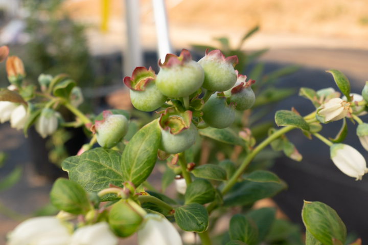 記者留意到,這里的藍莓并不是直接種植在土壤里,而是通過盆栽種植?!暗乩锶峭寥?,為什么不直接種到地里?”面對記者的提問,設施藍莓項目的相關負責人陳華成解釋道:“我們采用的是無土栽培技術。盆子里面裝的不是土壤,而是無土基質。”陳華成介紹,無土基質是根據藍莓的生長所需專門配備的,能讓藍莓在無菌的環境中生長,減少病害,提高成活率,讓藍莓能長得更好?!斑@不!今年7月剛小苗種下,而今藍莓苗已經實現了開花結果,預計2023年1月可以陸續有藍莓成熟,直到4月份?!?/p>