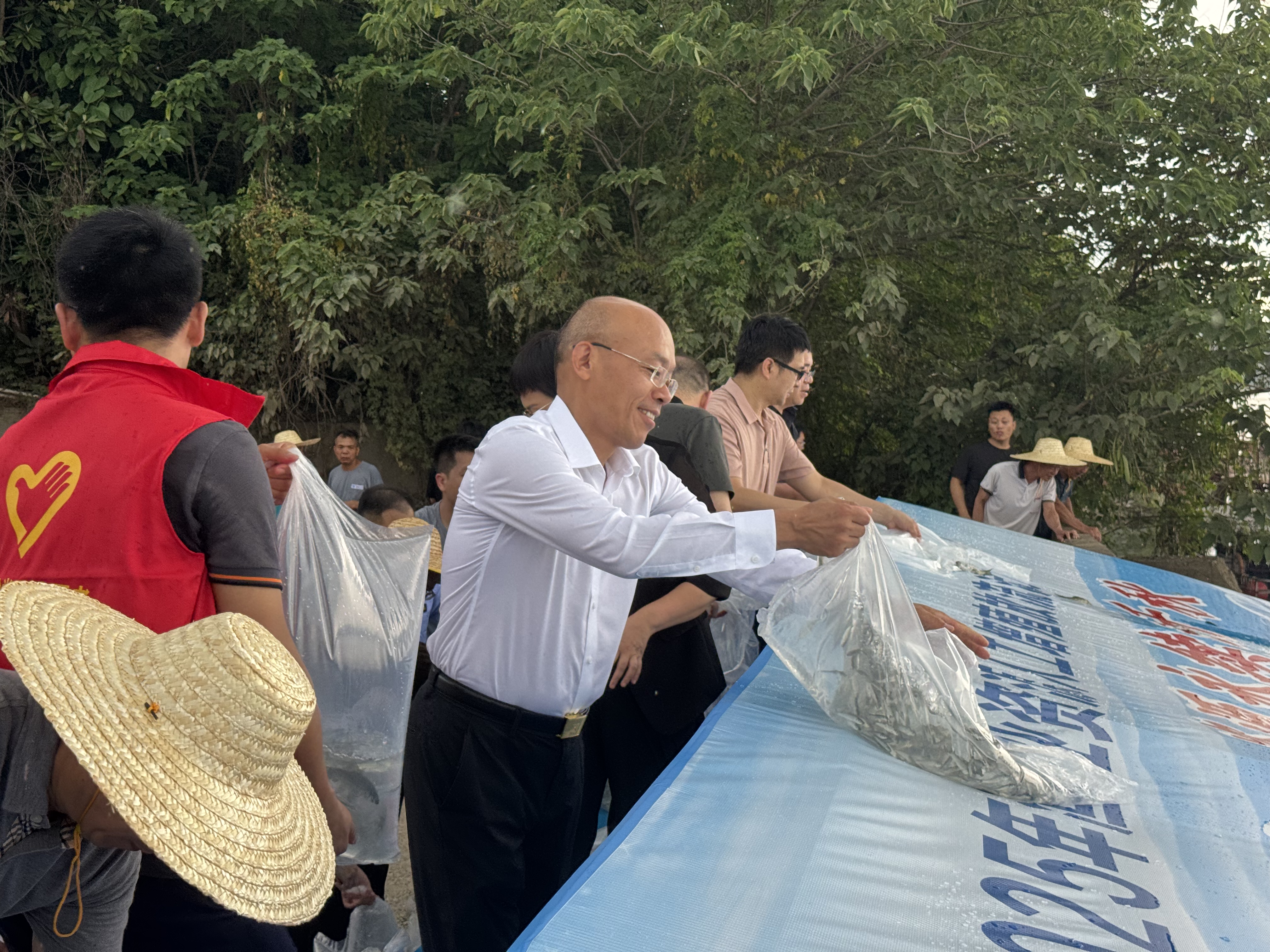 活動現場,工作人員小心翼翼地打開魚苗袋口,在飛濺的水花中,一尾尾經專業機構檢驗合格的鮮活魚苗順著滑道而下,迅速躍入碧波粼粼的東江中。