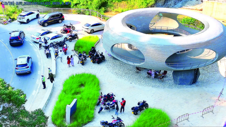 218最美旅游公路沿途設(shè)置的藝術(shù)裝置,既是網(wǎng)紅打卡點(diǎn),也是游人休憩的好去處。在博羅段中,綠屏石灘藝術(shù)裝置尤為吸睛。直徑16.5米的觀景環(huán)凌空懸于峭壁邊緣,下沉廣場(chǎng)與漂浮平臺(tái)構(gòu)成的雙層標(biāo)高景框,恰好將山水風(fēng)光框成一幅流動(dòng)的畫(huà),成為游客定格美景的絕佳選擇。休憩區(qū)里,摩旅愛(ài)好者與騎行愛(ài)好者圍坐閑談,手捧特色豆花拿鐵,你一言我一語(yǔ)分享著沿途所見(jiàn)的秀麗風(fēng)光。“一路風(fēng)景絕了!各個(gè)驛站和藝術(shù)裝置的間距特別合理,騎累了就坐下喝杯咖啡、看看山景,這種邊騎邊玩的愜意,是其他路線比不了的。”騎行愛(ài)好者鄧先生贊不絕口。他說(shuō),騎行群里常有人分享這條公路的美景與攻略,趁著國(guó)慶假期,他立刻約上好友來(lái)一場(chǎng)深度體驗(yàn)。羅浮山茶、東坡茶樂(lè)事等本地特色飲品,剛推出就成了游客爭(zhēng)先品嘗的“爆款”。