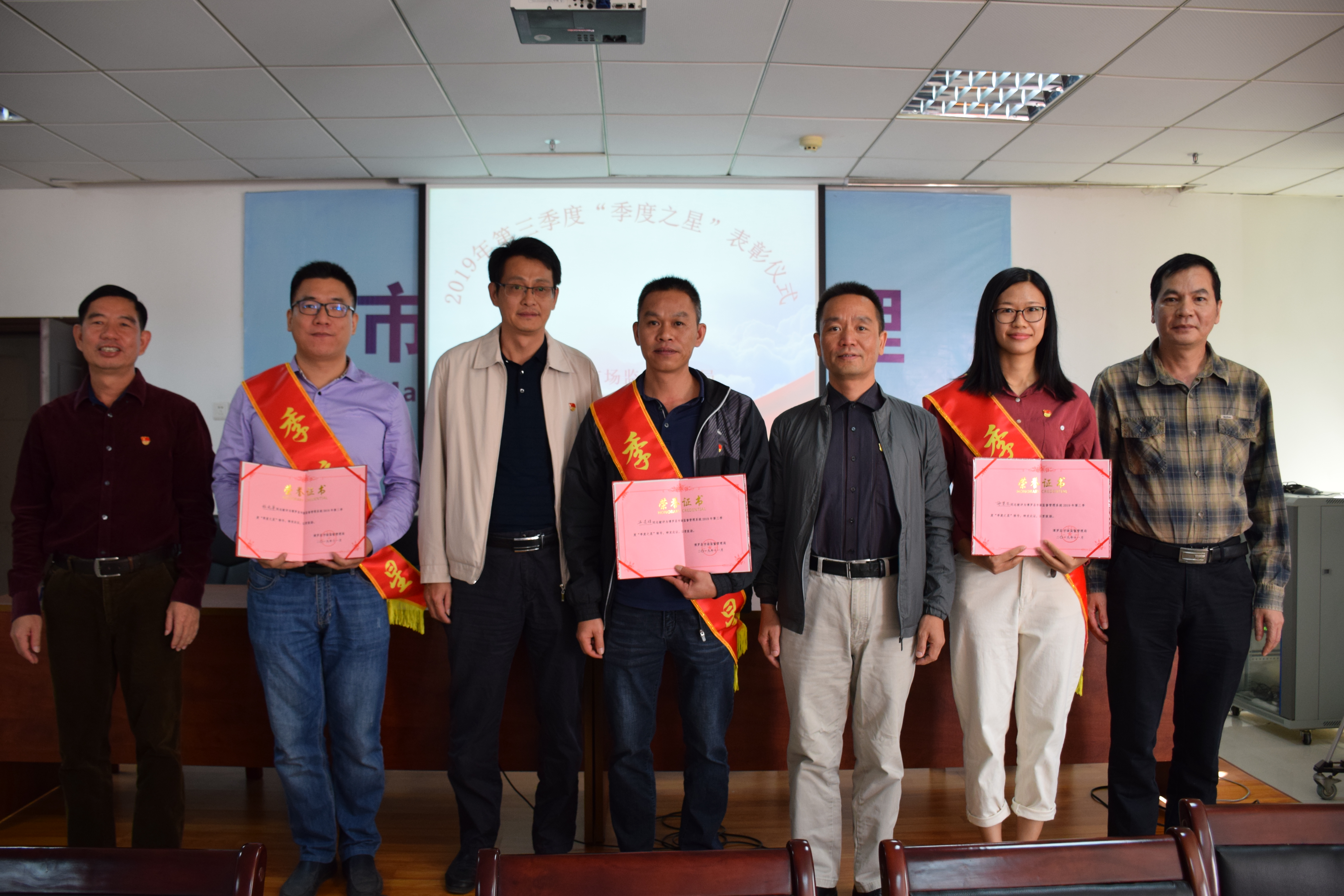 為扎實推進“不忘初心、牢記使命”主題教育,在全縣市場監管系統營造學先進、趕先進、當先進的濃厚氛圍,11月22日,縣市場監督管理局舉辦2019年第三季度“季度之星”表彰儀式,對工作積極、工作實績突出、群眾評價優良的三位同志進行表彰。
