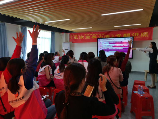 講座中,主講律師黃勵詳細介紹了制定和實施反家暴法的目的和意義,通過通俗易懂的語言,以案釋法,闡述了家庭暴力的危害,結合《反家庭暴力法》,就如何預防家庭暴力進行自我保護的問題提出了建議與維權途徑:一是堅持“零容忍”,對一切形式的家庭暴力采取零容忍態度;二是廣泛開展法治宣傳教育,提高家庭成員的法律認知水平,向婦女群眾提供維權服務,增強婦女自我保護意識,防患于未然;三是加強婦聯、公安機關、法院尋求幫助,通過合法途徑,依法維權。講座中對婦女受害者的保護和救助。鼓勵婦女向村(居)民委員會、鎮設置了知識問答環節,婦女們紛紛踴躍發言,現場氣氛活躍。