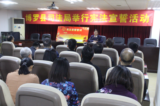 2019年12月4日,為了進一步弘揚憲法精神,牢固樹立全體干部職工的憲法意識,博羅縣司法局在局機關四樓會議室開展憲法宣誓活動。活動前,縣司法局黨組書記、局長廖偉峰作動員講話。廖偉峰同志指出12.4憲法宣傳日活動是普法宣傳的重要陣地,我們要把這個品牌活動做實做好,全局干部職工要自覺做憲法的弘揚者、傳播者、遵行者 。