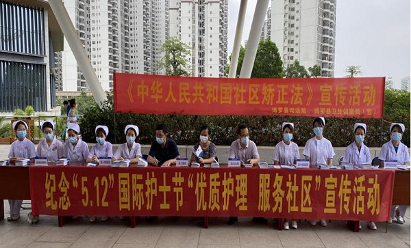 5月12日國際護士節(jié)當天,博羅縣司法局、縣衛(wèi)健局聯(lián)合組織社區(qū)矯正工作人員以及縣人民醫(yī)院、縣中醫(yī)醫(yī)院、縣婦幼保健院、羅陽街道社區(qū)衛(wèi)生服務(wù)中心等單位的護士到縣行政服務(wù)中心開展社區(qū)矯正法和疫情防控宣傳活動。宣傳活動中,白衣天使們到辦事大廳門口、樓道口、電梯口等群眾必經(jīng)路段派發(fā)社區(qū)矯正法、《新冠肺炎疫情防控》等宣傳資料,并為窗口工作人員、辦事群眾宣傳解答疫情防控和疾病預(yù)防相關(guān)知識,講解常見病、多發(fā)病的防治知識和護理方法,普及急救常識。