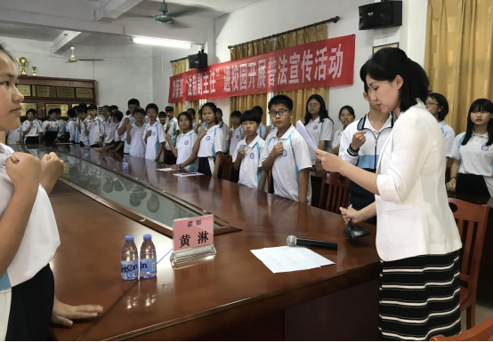 講座中,黃淋律師分別從尊崇憲法、學習憲法、以案說法、誦讀憲法“四大模塊”對憲法進行生動講解,并且通過法律知識問答、播放視頻、憲法宣誓等環節與學生積極互動,激發他們的學法熱情,播撒法治精神種子。課程通俗有趣,幫助在座250余名學生了解憲法的地位及重要意義,讓學生了解憲法、在內心尊崇憲法、從早從小樹立憲法法律至上的法治信仰。