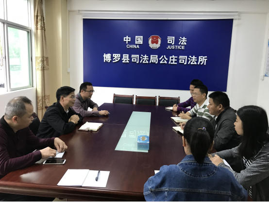2019年4月15日上午,博羅縣司法局廖偉峰局長帶領副局長陳慶輝、黨組成員余日春一行3人到公莊司法所進行調研,公莊鎮委鄒錦楊副書記參加調研座談會。首先,公莊所廖所長對司法所工作人員一一介紹,并對司法所的人民調解、安置幫教、社區矯正、普法宣傳等工作進行詳細匯報。縣局領導對公莊司法所的工作成績給予肯定,特別是對公莊司法所的法制宣傳工作和司法所隊伍團結精神給予充分肯定和表揚。