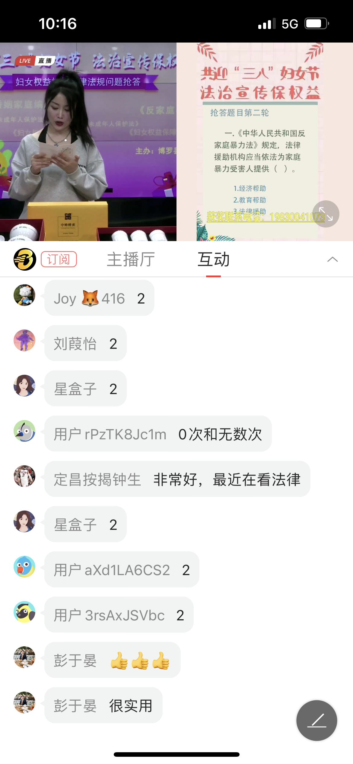本次直播活動(dòng)通過(guò)法治問(wèn)題搶答和相關(guān)法律法規(guī)解讀展播的方式進(jìn)行。主持人隨機(jī)抽取問(wèn)答題,題目涵蓋《民法典》之婚姻家庭篇、《婦女權(quán)益保障法》《反家庭暴力法》等與婦女權(quán)益相關(guān)的法律法規(guī)內(nèi)容。直播觀眾在直播頁(yè)面搶答后,由“博羅縣三八紅旗手”、縣司法局法律顧問(wèn)與規(guī)范性文件審查股負(fù)責(zé)人余曉瓊公布答案并剖析解讀相關(guān)法律法規(guī)。網(wǎng)友答題熱烈,留言不斷,答題速度一輪更比一輪快,直播間高潮迭起、刷屏熱傳。
