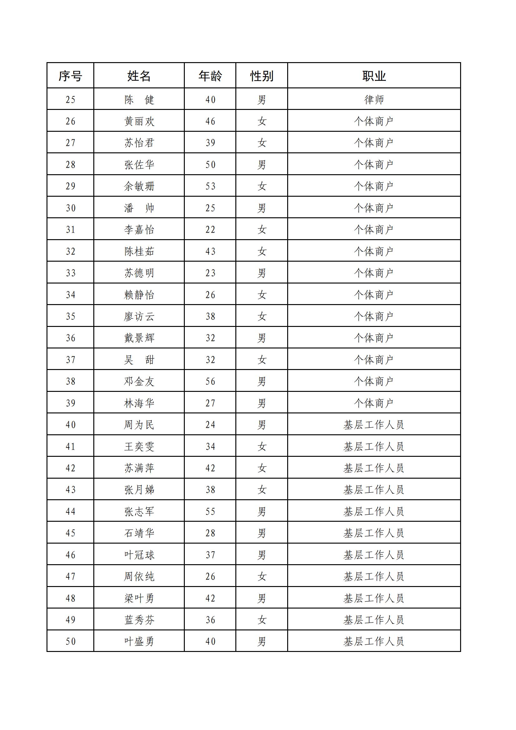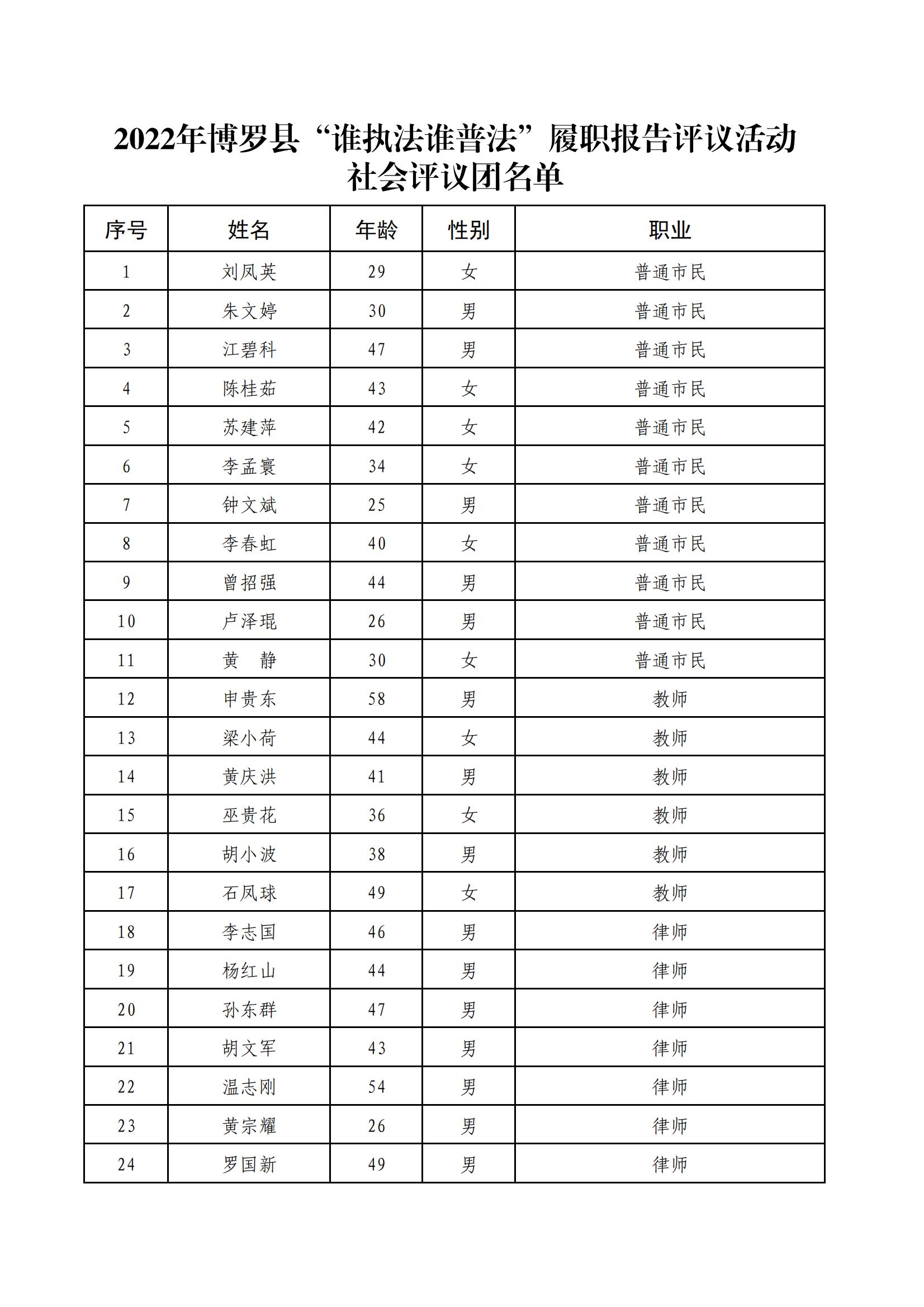 為保證履職評議活動更加客觀公正,博羅縣今年開拓創新,運用網絡新媒體平臺,面向全縣招募不同身份的人員組建一支規模為50人的社會評議團,擴大群眾評議渠道,充分發揮社會力量參與法治建設,努力打通群眾參與評議“最后一公里”。活動招募以來,博羅縣社會各界人員踴躍報名參與,他們有基層工作人員、企業代表、教師、律師,還有個體商戶、農民等,充分展現了群眾對普法工作的熱情與支持。當前50位社會評議團成員已經誕生,現將名單公布: