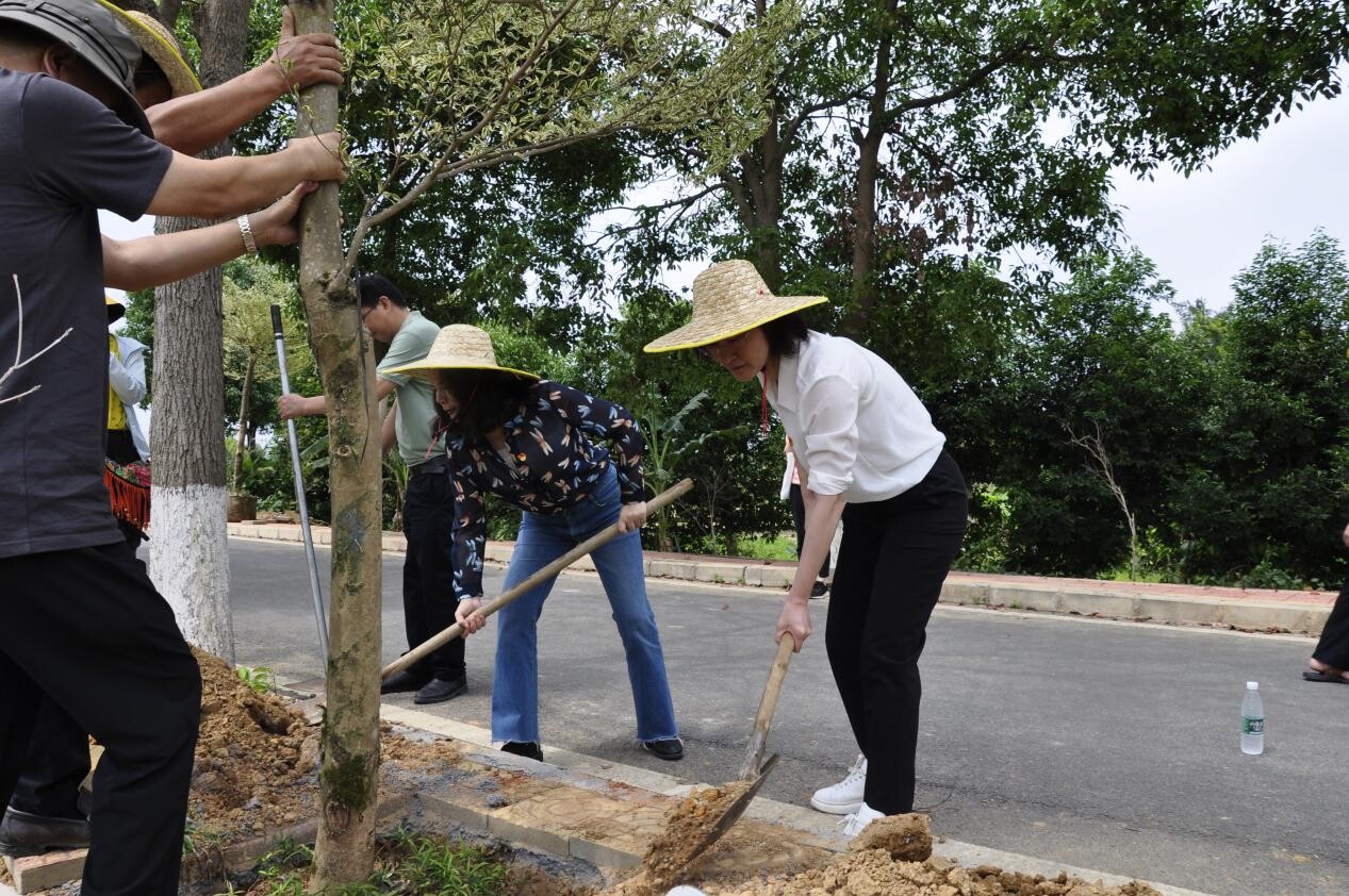 植樹現場,參與植樹的人員揮鍬鏟土,搬運、澆灌樹苗,一片熱火朝天的忙碌景象。在大家的努力下,共種植紫花風鈴、黃花風鈴、宮粉紫荊等樹種196棵,為洪湖村添上一道美麗的風景線。