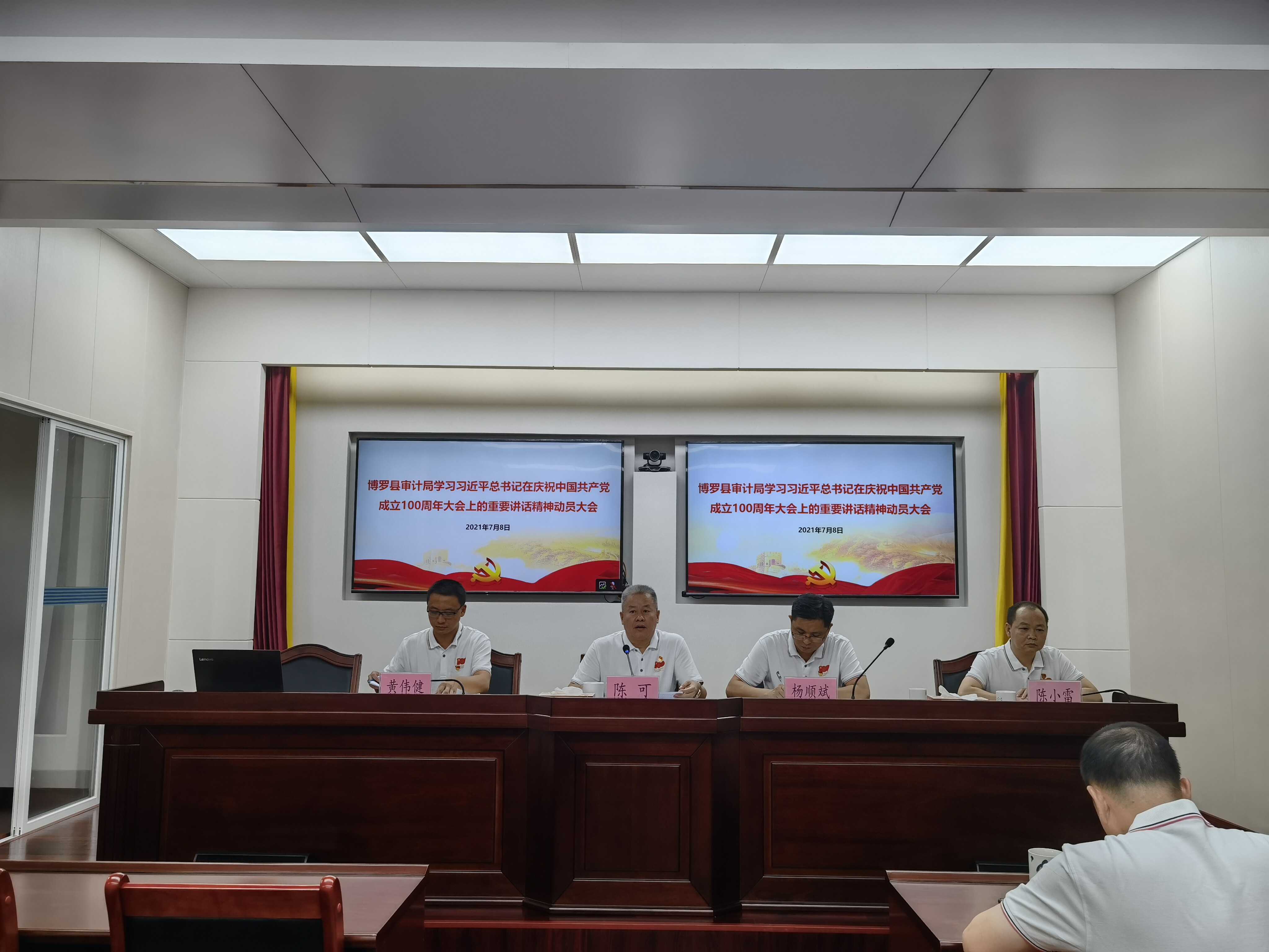 2021年7月8日上午, 博羅縣審計(jì)局召開學(xué)習(xí)貫徹習(xí)近平總書記在慶祝中國共產(chǎn)黨成立100周年大會(huì)上的重要講話精神動(dòng)員大會(huì)。會(huì)議傳達(dá)學(xué)習(xí)了習(xí)近平總書記在慶祝中國共產(chǎn)黨成立100周年大會(huì)上的重要講話精神和省、市、縣學(xué)習(xí)貫徹習(xí)近平總書記在慶祝中國共產(chǎn)黨成立100周年大會(huì)上的重要講話精神干部動(dòng)員大會(huì)精神,并對(duì)我局學(xué)習(xí)宣傳貫徹工作進(jìn)行全面部署。縣審計(jì)局全體審計(jì)人員參加會(huì)議,縣審計(jì)局黨組書記、局長陳可作動(dòng)員講話。