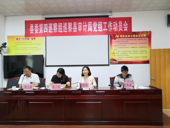 按照縣委巡察工作領導小組統一部署,4月11日,縣委第四巡察組進駐縣審計局,并召開巡察工作動員會,對巡察工作做出具體安排??h委巡察辦主任、縣委巡察工作領導小組成員、縣紀委常委林少瓊同志,縣委第四巡察組組長林巧玲同志,副組長張偉強同志,巡察組全體成員,縣紀委駐政府系統紀檢組副組長李振平同志,縣審計局領導班子,縣審計局全體干部職工參加了會議。會議由縣審計局黨組書記、局長陳志謀主持,林巧玲組長作了動員講話,林少瓊主任對巡察工作提出了指導意見,陳志謀書記作了表態發言,張偉強副組長布置了干部測評和調查問卷工作。