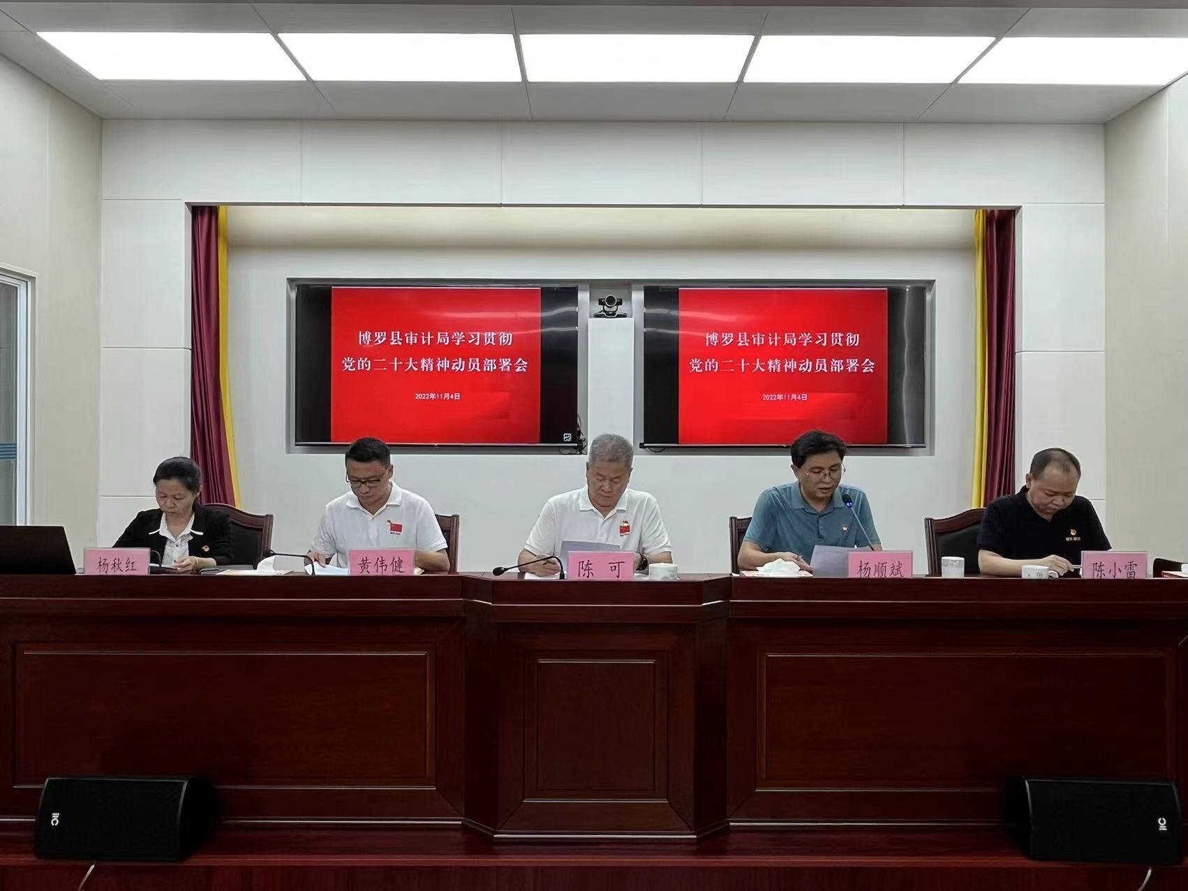 2022年11月4日下午,博羅縣審計局召開學習貫徹黨的二十大精神動員部署會,傳達學習黨的二十大精神,對做好我局學習宣傳貫徹工作進行動員部署。會議由縣審計局黨組成員、副局長楊順斌主持,縣審計局黨組書記、局長陳可作動員講話,全體審計人員參加會議。