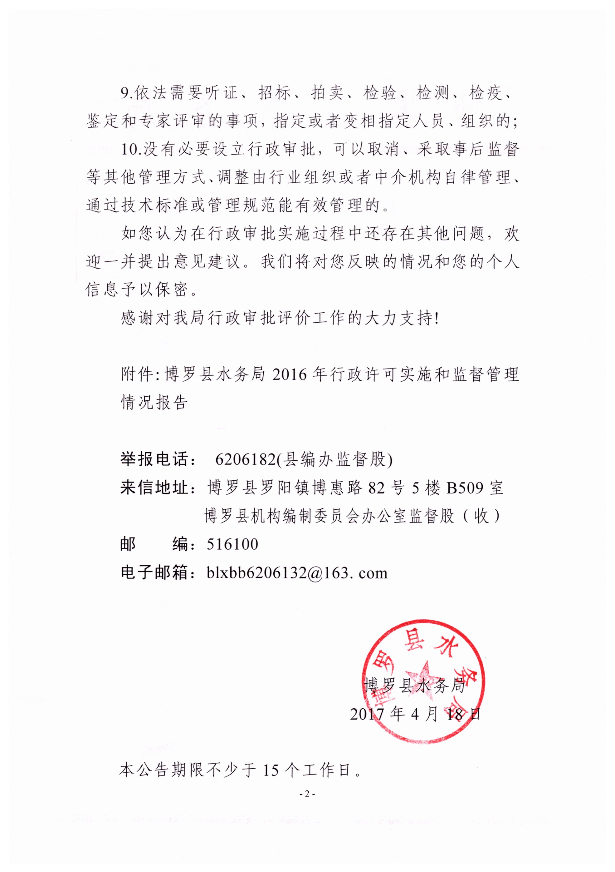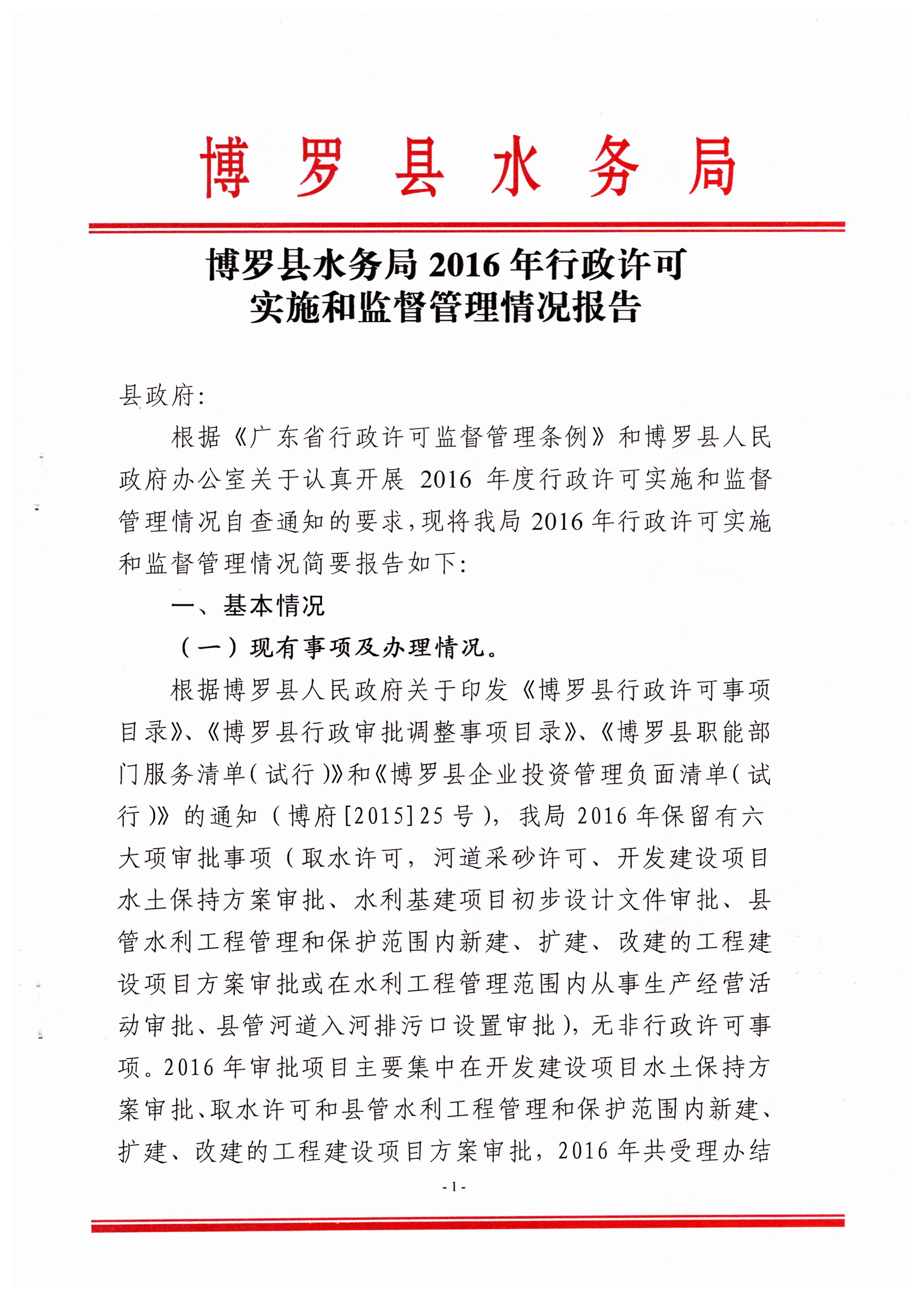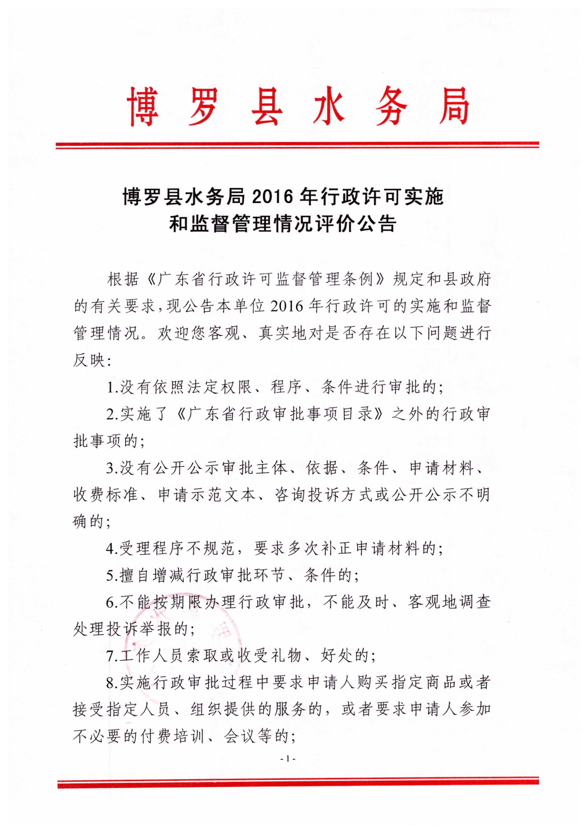 博羅縣水務局2016年行政許可實施和監(jiān)督管理情況評價公告