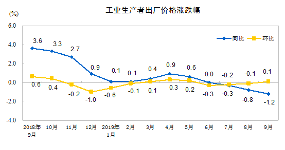 2019年9月份,全國工業生產者出廠價格同比下降1.2%,環比上漲0.1%;工業生產者購進價格同比下降1.7%,環比上漲0.2%。1—9月平均,工業生產者出廠價格與去年同期持平,工業生產者購進價格下降0.3%。