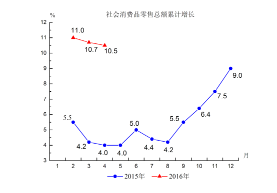 (四)消費市場保持平穩。今年以來,全縣消費市場運行較為平穩,社會消費品零售總額增幅保持在10%-11%之間。1-4月,全縣實現社會消費品零售總額53.19億元,增長10.5%,增幅比上年同期提高6.5個百分點,比1-3月和1-2月分別回落0.2個和0.5個百分點。其中,網報企業(個體)零售額增長19.8%,增幅比上年同期提高19.5個百分點;分支機構零售額下降5.2%,降幅比上年同期收窄14.1個百分點。