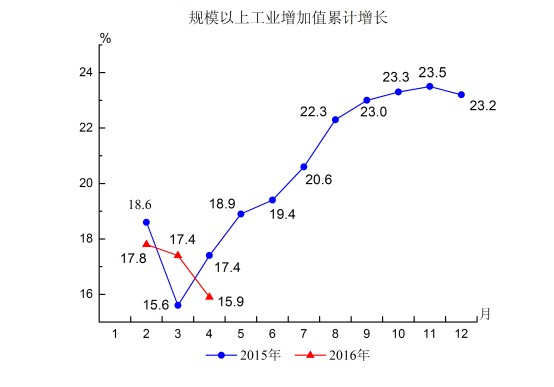(一)工業生產保持穩定。今年以來,全縣工業經濟在艱難中前行,各月累計增速雖有所回落,但總體保持穩定。1-4月,全縣規模以上工業實現總產值383.68億元,增長13%;實現增加值93.57億元,增長15.9%,增幅比1-3月回落1.4個百分點。
