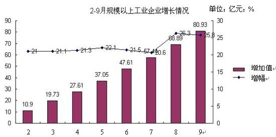 3、規(guī)模以上工業(yè)增加值80.93億元,增長(zhǎng)25.8%,增幅同比提高5.2個(gè)百分點(diǎn),比1-8月下降1.3個(gè)百分點(diǎn),低于全市平均水平(27.3%)1.5個(gè)百分點(diǎn)。