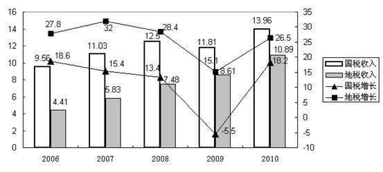 表4:2006-2010國、地稅收入及增幅