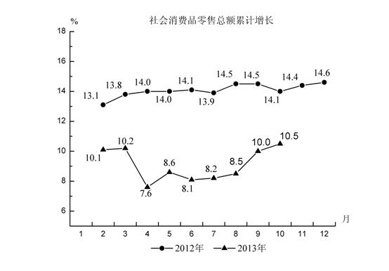 隨著城鎮和農村居民收入的繼續增長,消費市場逐步回暖,全縣社會消費品零售總額增速自1-6月累計增長8.1%以來,此后每月有所提升,呈現穩中趨升的態勢。截至10月,全縣社會消費品零售總額102.11億元,同比增長10.5%,比1-9提高0.5個百分點。