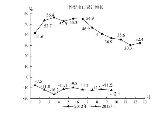 1-9月,全縣外貿進出口總額27.49億美元,下降9.1%,比1-8月回落0.2個百分點。其中,外貿出口總額18.60億美元,下降12.1%,比1-8月回落0.6個百分點;外貿進口總額8.89億美元,下降2%,比1-8月收窄0.8個百分點。外貿出口的回落主要源于占出口比重73.8%的進料加工出口的下降。1-9月,進料加工出口13.72億美元,下降15.9%,高于外貿出口下降幅度3.8個百分點。一般貿易出口、來料加工出口、進料加工出口的比重分別為23.7:2.6:73.7,對比去年同期的20.3:2.2:77.5,一般貿易出口的比重上升3.4個百分點,表明外貿自主性增強,外貿出口結構改善。