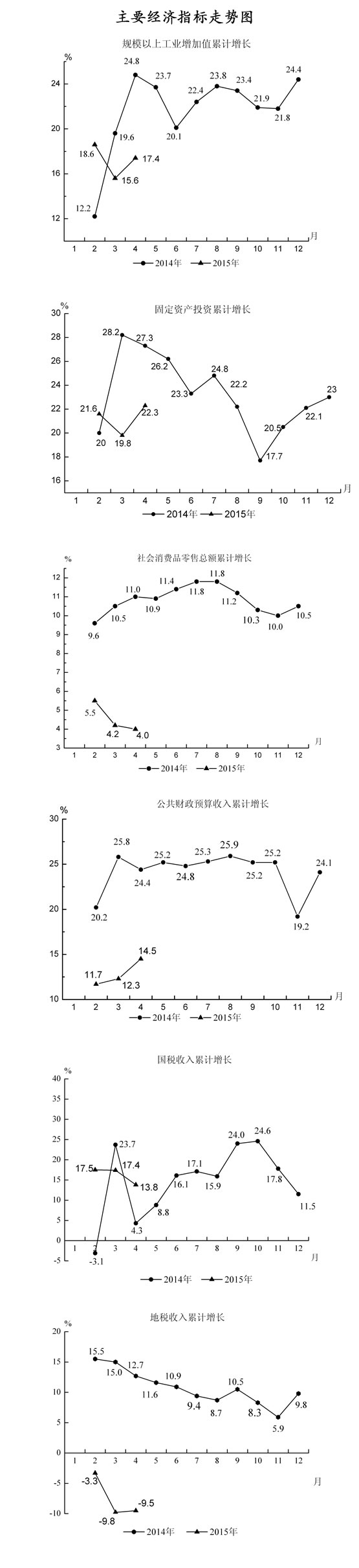 (三)財政收支保持增長。1-4月,全縣一般公共預算收入11.09億元,增長14.5%,增幅比上年同期回落9.9個百分點,比1-3月提高2.2個百分點。一般公共預算支出19.17億元,增長22.8%,增幅比上年同期提高7.2個百分點,比1-3月提高5.6個百分點。民生保障進一步加強。其中,節能環保支出0.39億元,增長2.67倍;文化體育與傳媒支出0.98億元,增長2.35倍;城鄉社區支出1.17億元,增長1.61倍;教育支出5.12億元,增長29.3%;農林水支出2.12億元,增長14%;社會保障和就業支出1.59億元,增長3.8%。