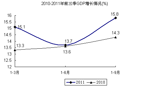 今年一季度GDP增幅為15.1%,實現了近十多年來最好的開局,隨后,由于規模以上工業增速回落,上半年GDP增速有所回調,為13.7%。進入第三季度,在新上企業富士康以及主要行業較快增長的拉動,1-9月規模以上工業增加值增幅為25%,比上半年提高了3.3個百分點,受工業快速增長的拉動,前三季度全縣GDP進一步提速,增幅為15.8%,快于去年同期1.5個百分點,快于一季度0.7個百分點,快于上半年2.1個百分點(詳見表1),從表1可以看出,與去年同期對比,GDP的增長速度明顯加快,其中,一季度和前三季度分別比去年同期提高了1.8個和1.5個百分點,GDP加快上行,為力爭實現全年目標任務提供了重要保障。