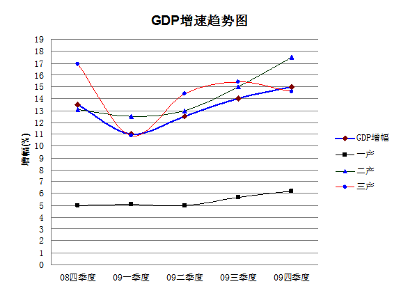 (一)一個趨勢性轉折:經濟發展態勢從2008年底的急降轉為2009年初的穩步提升。博羅緊緊圍繞“打基礎、強產業、保民生”這個突破口,實施一系列應對措施,增強經濟企穩回升動力,經濟加速下滑的階段已經過去,較為平穩的增長拐點已經在第一季度出現,保增長初見成效。從GDP運行走勢看,2008年二季度GDP增長15%,然后一路下滑到全年的13.5%,2009年一季度進一步下滑到11%,至此經濟走勢出現拐點,從第二季度開始企穩向好,二、三季度分別增長12.5%、14%,全年增長15%,經濟運行走出了一個漂亮“V”字形(見下圖)。