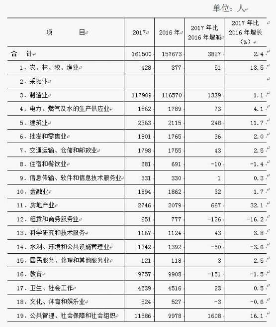 2017年,在統的18個行業門類中,從業人員比上年增加的有13個行業,占行業總數的72.2%,人員減少的有5個行業,占27.8%。人數增加較多的行業有公共管理、社會保障和社會組織,制造業,房地產業,分別比上年增加1608人、1339人和667人,分別增長16.1%、1.1%和32.1%。人數減少較多的行業有教育業、租賃和商務服務業,水利、環境和公共設施管理業,分別比上年減少151人、126人和50人,分別下降1.5%、16.2%和3.6%。(見表1)