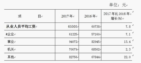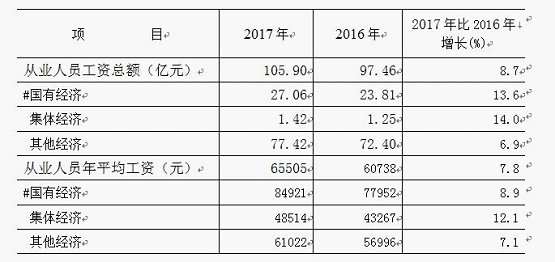 2017年,國有單位單位從業人員工資總額為27.06億元,比上年增長13.6%;從業人員年平均工資為84921元,比上年增長8.9%。集體單位從業人員工資總額為1.42億元,比上年增長14%;從業人員年平均工資為48514元,比上年增長12.1%。其他單位從業人員工資總額為77.42億元,比上年增長6.9%;從業人員年平均工資為61022元,比上年增長7.1%。(見表2)