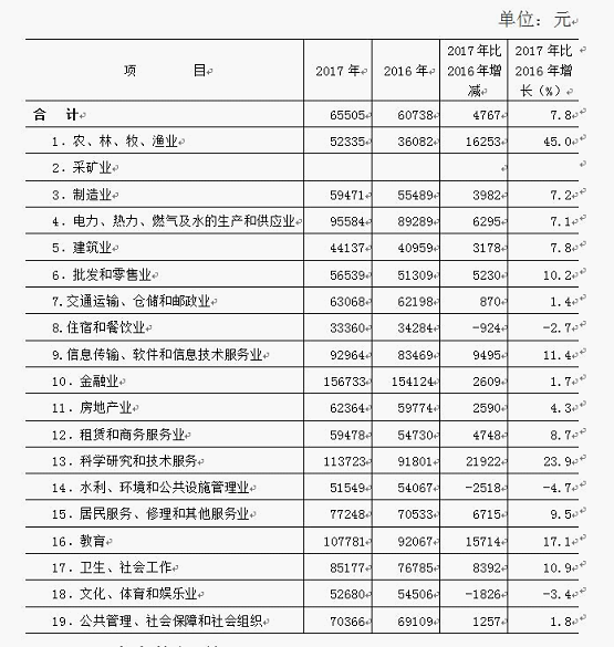 從年平均工資增速看,增速位于前三位的依次是農、林、牧、漁業(增長45%),科學研究和技術服務業(增長23.9%),教育業(增長17.1%)。排在后三位的依次是水利、環境和公共設施管理業(下降4.7%),文化、體育和娛樂業(下降3.4%),住宿和餐飲業(下降2.7%)。農、林、牧、漁業工資增速較快主要源于林場林產品價格提高,企業利潤上升。科學研究和技術服務業,教育業工資增長較快源于2017年績效工資增加。