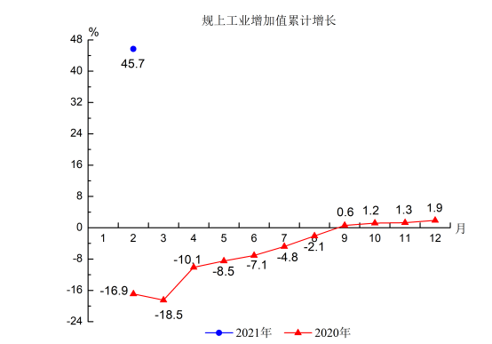 1.規(guī)模以上工業(yè)增加值同比增長45.7%,比2019年1-2月增長21.1%,兩年平均增速為11.6%。