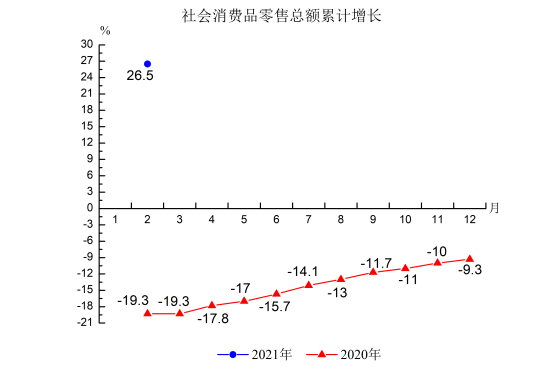 3.社會消費(fèi)品零售總額51.43億元,同比增長26.5%,比2019年1-2月增長2.1%,兩年平均增速為1%。