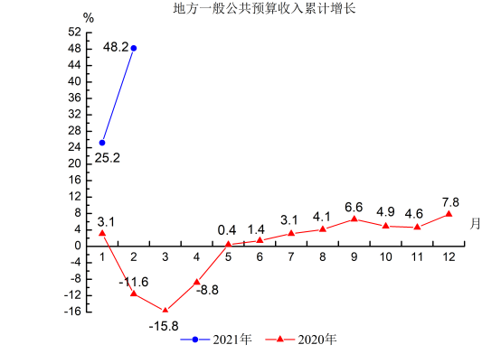 5.財稅收入較快增長。1-2月,全縣完成國內(nèi)稅收收入18.85億元,同比增加5.28億元,增長38.9%,是2012年以來增速首次超30%。其中,國內(nèi)增值稅8.92億元,同比增加1.88億元,增長26.8%;企業(yè)所得稅4.55億元,同比增加1.3億元,增長40.1%;土地增值稅1.65億元,同比增加0.49億元,增長41.7%。全縣一般公共預(yù)算收入完成9.27億元,同比增加3.01億元,增長48.2%,是1994年以來的最高增速,自2009年以來首次超30%;其中稅收收入6.63億元,同比增加2.17億元,增長48.8%;稅收收入占預(yù)算收入的71.5%,比重同比提高0.3個百分點(diǎn)。全縣一般公共預(yù)算支出28.79億元,同比增加7.21億元,增長33.4%。民生及疫情防控重點(diǎn)領(lǐng)域支出實(shí)現(xiàn)較快增長,衛(wèi)生健康支出、社會保障和就業(yè)支出增量最大,分別完成5.5億元和3.27億元,同比分別增加3.37億元和1.8億元,分別增長158%和123.5%。