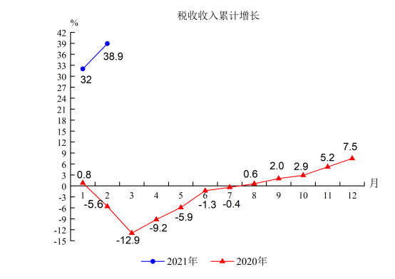5.國內(nèi)稅收收入18.85億元,同比增長38.9%,比2019年1-2月增長31.1%,兩年平均增速為14.5%。