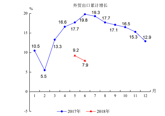 11.1-6月外貿出口85.32億元,增長7.9%,增幅比去年同期回落11.9個百分點。