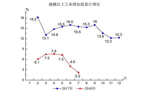 1.規模以上工業增加值增長2.2%,增幅比去年同期回落13.3個百分點。
