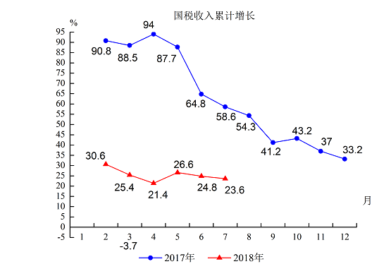 經濟運行下行壓力不減。從工業看,6月份以來,工業增加值增幅逐步回落,增速從1-3月的7.5%下降到1-7月的2.2%。從投資看,工業投資雖然增幅有所回升,但增速仍然處于低位,1-7月僅增長6.3%。從財政看,一般公共預算收入增速逐月回落,增速從1-2月的21.5%下降至1-7月的5.4%